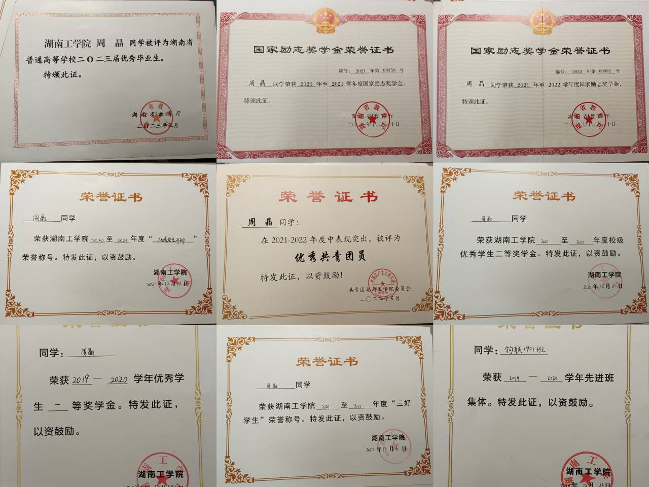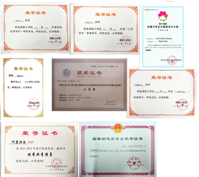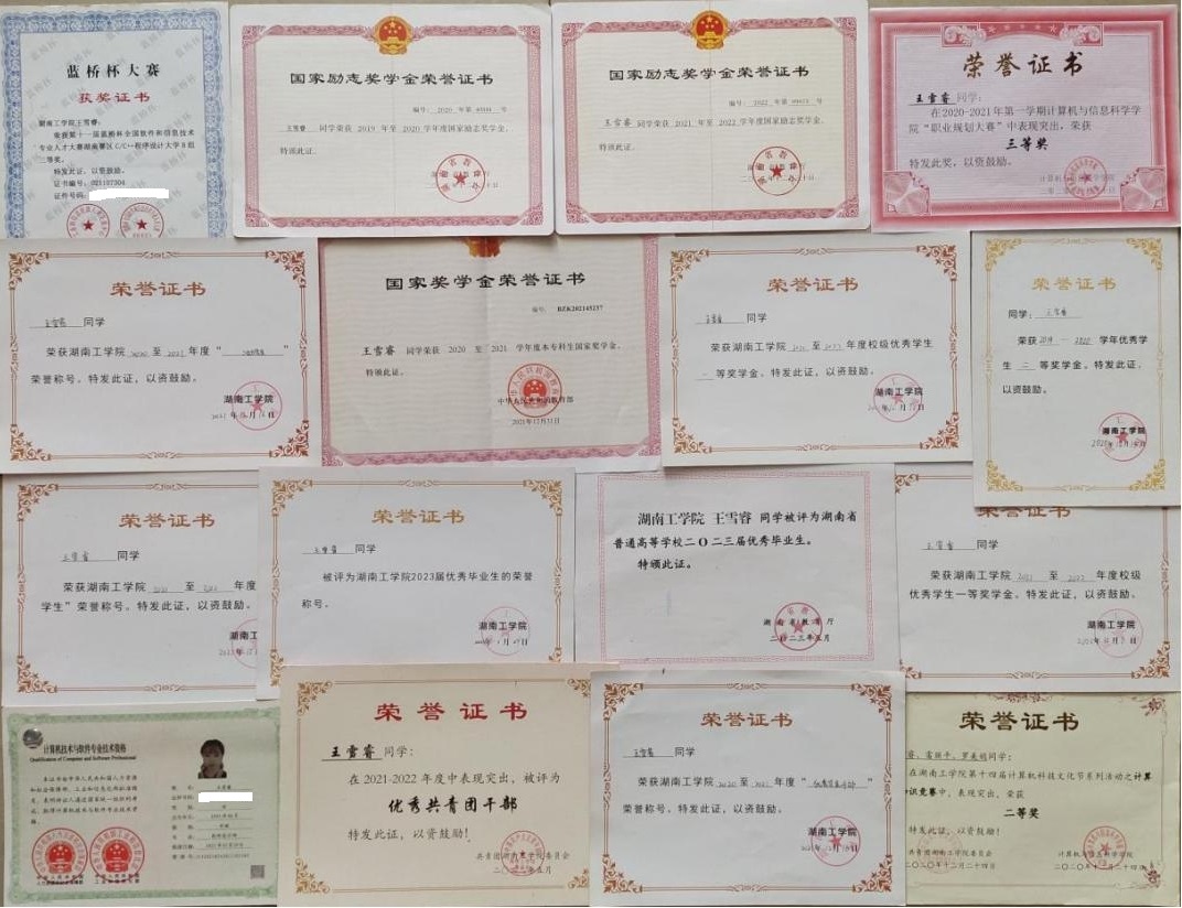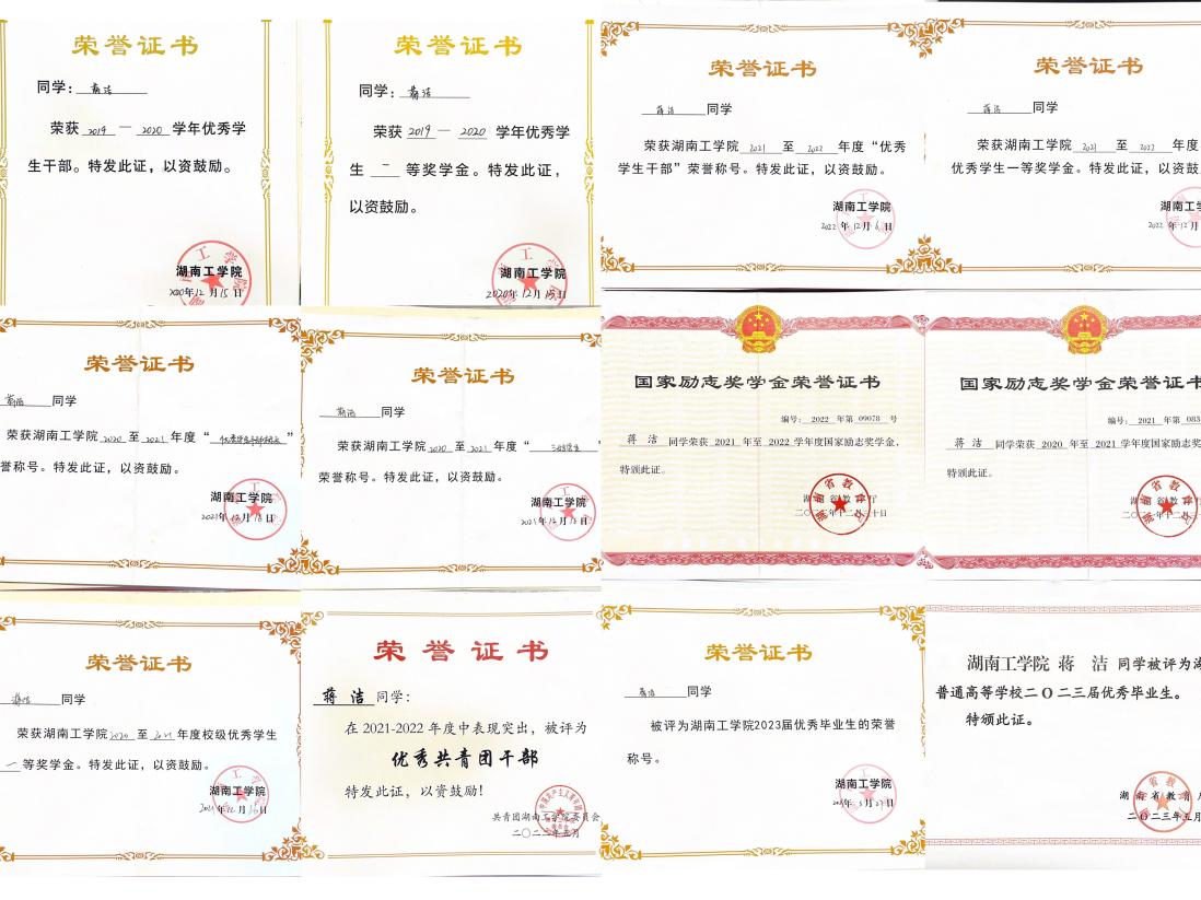 在校期间荣获国家奖学金1次、国家励志奖学金2次,获得软件设计师证书、蓝桥杯湖南赛区C/C++程序设计大赛B组三等奖、校级一等奖学金2次、校级二等奖学金1次、校级三好学生2次、优秀共青团干部1次、优秀学生干部1次。