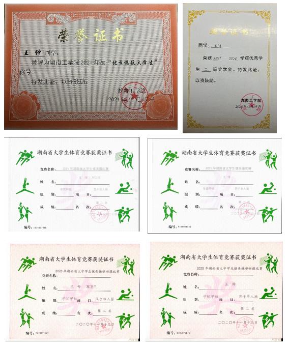 荣获校级二等奖学金1次、校级三等奖学金1次、校级优秀退役大学生2次。参加湖南省大学生健美操拉拉操比赛,获得男子单人操第二名2次,混合双人操第二名2次。