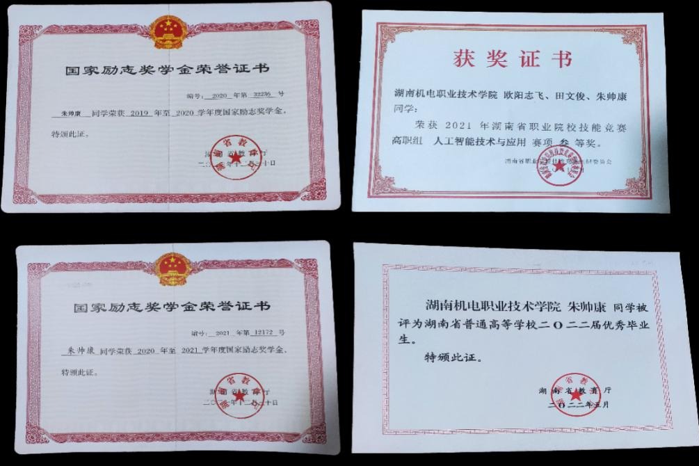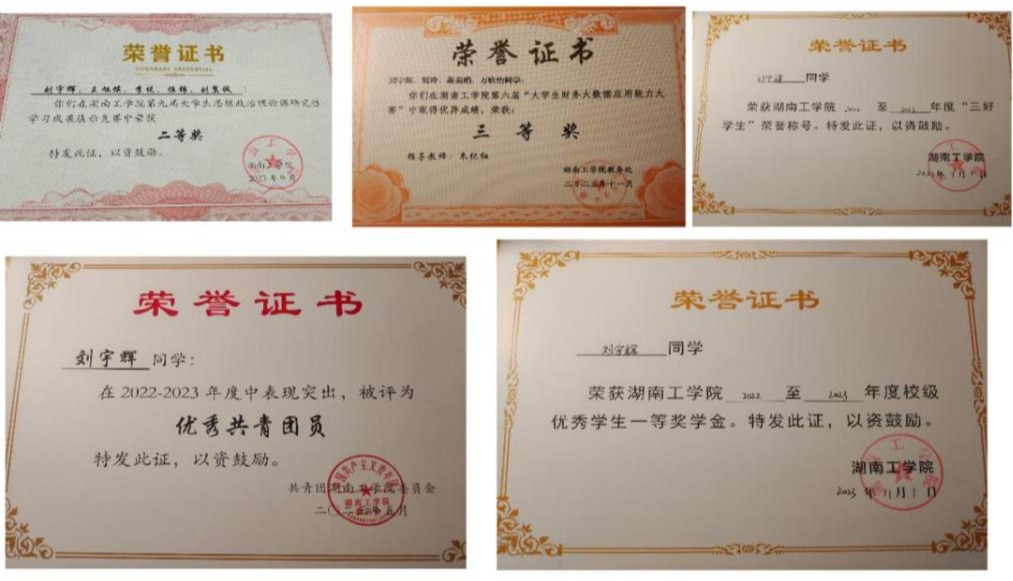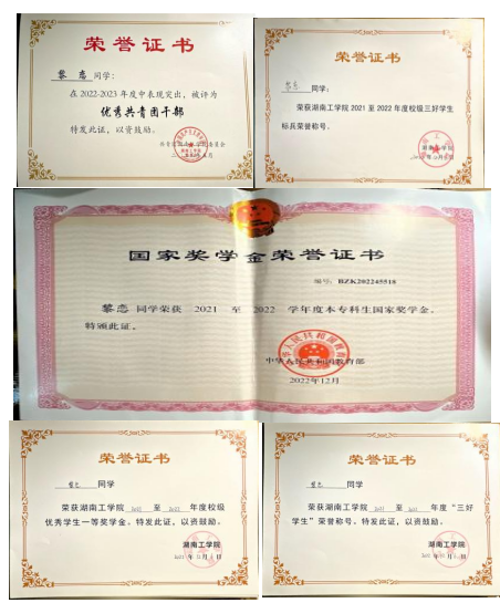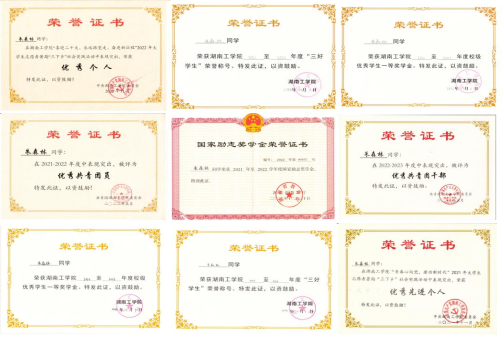 在校期间荣获国家励志奖学金1次、校级一等奖学金1次、校级优秀三好学生1次、校级优秀共青团员1次、优秀班干部1次,学习成绩排名第一,综合成绩排名专业第一。在校期间积极参加比赛活动,曾获得省级奖项荣誉1次、校级奖项荣誉6次。