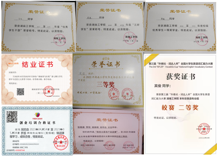 在校期间荣获国家励志奖学金1次、校级一等奖学金1次、校级校级三好学生1次、校级优秀学生干部1次、优秀班委1次。主持省级大创一项,曾获得“外教社·词达人杯”大赛二等奖、数字媒体创意设计大赛三等奖等。