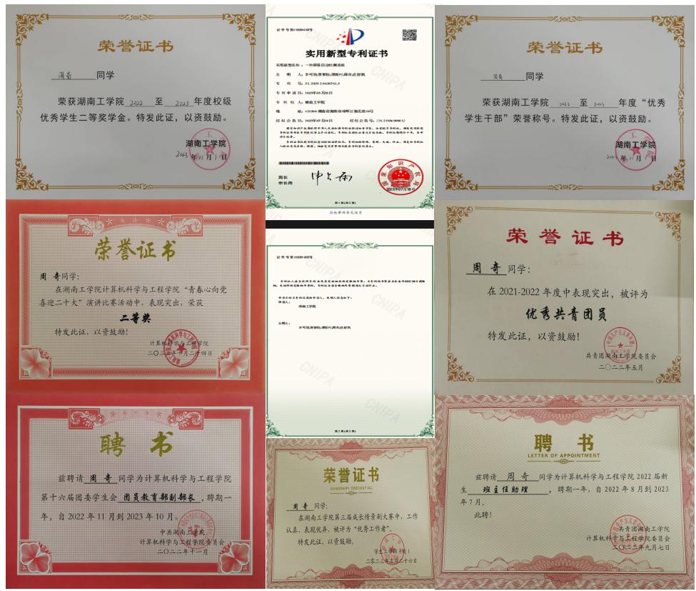 在校期间荣获国家励志奖学金1次、校级一等奖学金1次、校级优秀学生干部1次、校级优秀共青团员1次、优秀班干部1次,综合成绩排名专业第一。曾参加第十六届中国大学生计算机设计大赛获中南赛区三等奖,在学院工作期间,热心服务同学,荣获团委学生会“优秀工作者”称号。