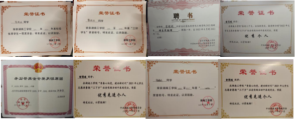 在校期间多次获得省、校级荣誉,荣获国家励志奖学金2次、校级一等奖学金2次、校级三好学生2次、校级三好学生标兵1次、校级三下乡优秀个人2次、校级优秀共青团干部1次、校级优秀共青团员1次。