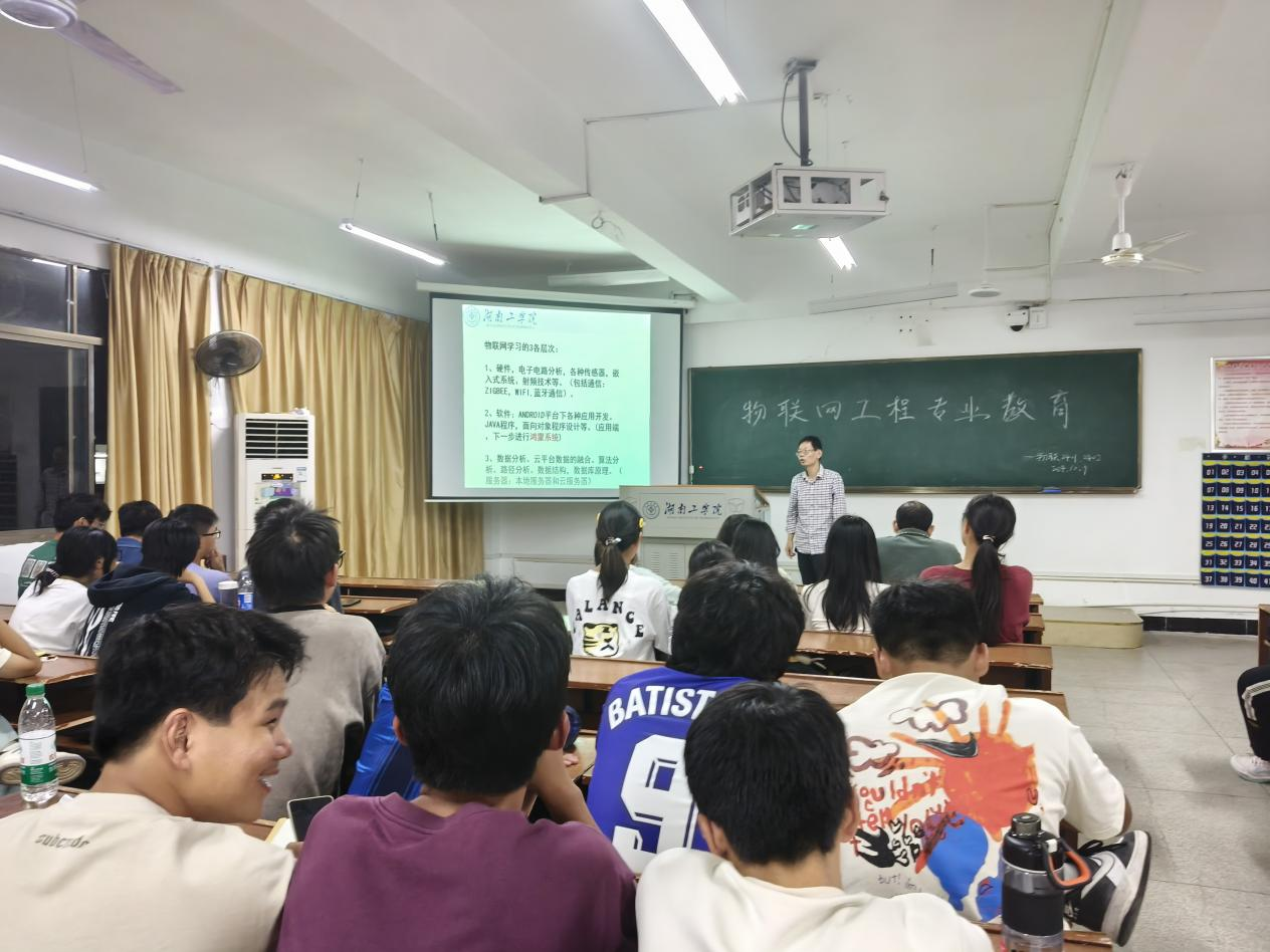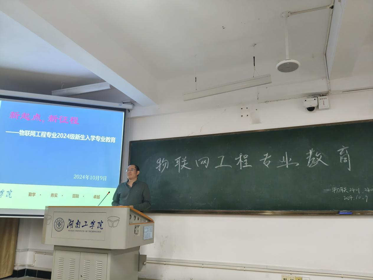 为促进新生迅速融入大学生活,加深同学们对物联网工程专业的认识,激励大家树立宏伟目标,踏上新的奋斗征程,持续拼搏,达成新梦想,2024年10月9日晚上物联网工程教研室开展新生专业教育活动。本次活动在2610进行,教研室主任曾利军主持会议,计算机科学与工程学院副院长戴成秋、专业带头人洪露教授、物联网工程专业部分专任教师、辅导员老师、受邀企业技术代表、2024级新生参加会议。