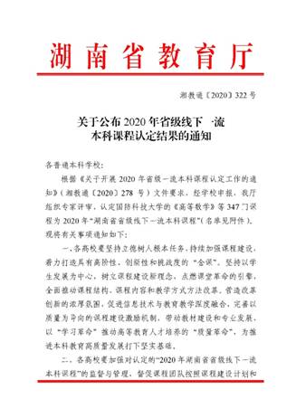 近日,湖南省教育厅发布了《关于公布2020年省级线下一流本科课程认定结果的通知》(湘教通[2020] 322号,见附件),伟德推荐省级的7门课程顺利通过认定,现将通知转发,请各教学单位注意查收。