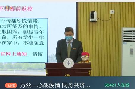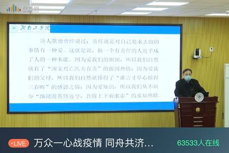 校党委书记谢国保教授讲授了在新冠肺炎抗疫特殊时期“责任”二字的深刻含义。他说,“责任,聚于心而成于行”,保护好自己,就是对他人生命安全的负责,就是在为这场“战疫”做贡献;“责任,源于梦想”,要始终坚持弘扬主旋律,坚定走中国特色社会主义道路的信念;“责任,成就梦想”,勇担时代使命,尊重自然、尊重生命、保护环境,努力成长为一个学问精深、精神富有、品德高尚的年轻人。最后,谢国保书记寄语全校学生:“疫情割断不了亲情,无论你身在何方,请记得学校的老师们时刻牵挂着你,也盼望着大家都能以健康、阳光的姿态踏上返校之路”。