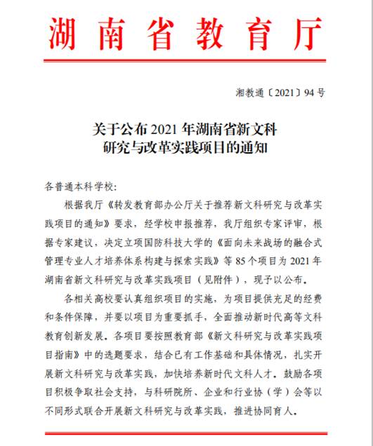 根据湖南省教育厅《转发教育部办公厅关于推荐新文科研究与改革实践项目的通知》和伟德源自英国1946《关于组织申报新文科研究与改革实践项目的通知》(院教务[2021]36号)要求,经个人申请、二级单位推荐、教务处形式审查、会评审定,伟德推荐刘升学主持的《新文科背景下“两型三化”新经管人才培养模式创新与实践》与何建雄主持的《数智赋能:新文科背景下地方高校财会人才应用能力培养之实践探索》两个项目通过了省级项目认定。