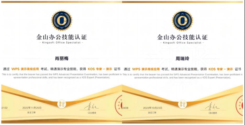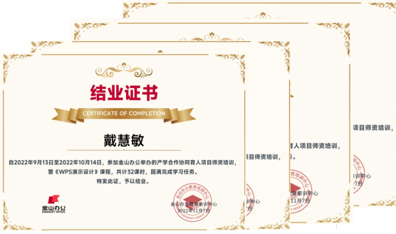 本次培训课程内容覆盖演示文稿在办公和教学中的常见实用技能,培训持续时长为1个月,培训通过“32课时线上视频+5次线上直播课”的形式开展,并以微信群的方式为教师提供答疑、督学等服务,全方位保障培训成效。最终伟德共有24位教师全程参与师培项目,完成线上视频学习和课后练习,获得了WPS演示课程结业证书。随后,更有4位教师通过WPS演示高级应用考试,精通演示专业技能,获得KOS专家——演示证书。