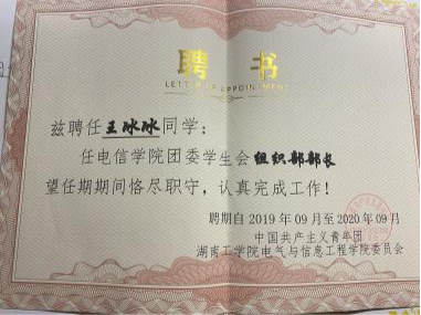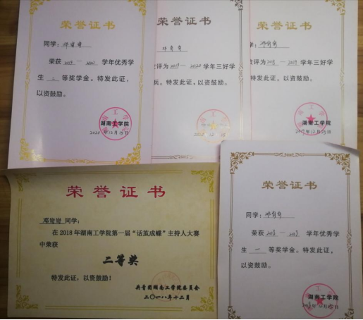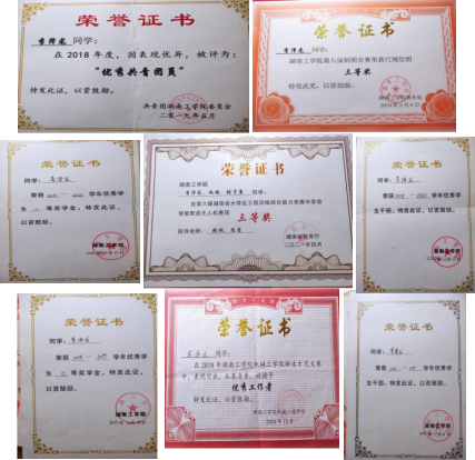 在校期间,连续两年专业成绩第一,整个大学生涯绩点专业第一,顺利通过英语四六级,获国家奖学金一次,国家励志奖学金两次,校一等奖学金两次,校友学习标兵奖学金,校级三好学生两次,校级优秀学生干部一次,湖南省优秀共青团干部,以及优秀工作者若干。