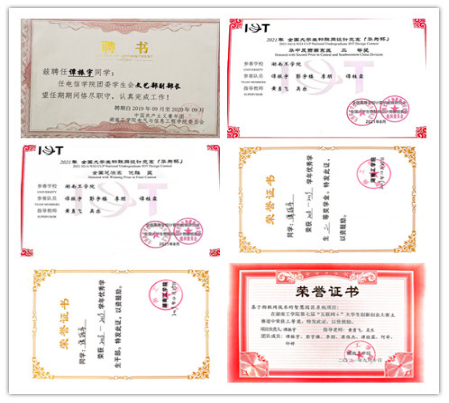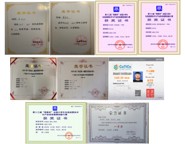 在校期间获得国家奖学金一次、校级一等奖学金两次、三好学生一次、校级二等奖学金一次,在“李冰”校友奖学金中获科技实践奖。在CaTICs竞赛中获得一等奖,在2020年广东省第一届职业技能大赛中获得个人二等奖、团队二等奖,在第十三届“高教杯”先进成图大赛获得团体全国二等奖和两项个人全国一等奖,在第六届湖南省大学生工程训练综合能力竞赛中获得热能驱动车赛项一等奖。