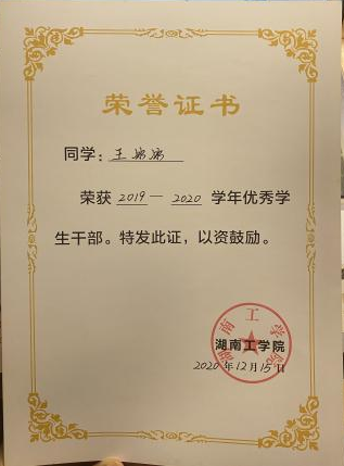 在校期间获评国家奖学金、国家励志奖学金、校一等优秀学生奖学金、校三好学生、校三好学生标兵、优秀共青团员、优秀共青团干部等多项荣誉。参加CaTICs网络大赛并获得CAD团队赛一等奖和CAD职业证书二级;加入雁鸣合唱团期间荣获伟德源自英国1946新生军训歌咏比赛二等奖;参加湖南省全国大学生成图大赛荣获个人全能一等奖,参加第十四届“高教杯”全国大学生成图大赛获得个人全能二等奖;暑假期间,参加家乡青年志愿者活动荣获独塘乡抗疫志愿活动“最美志愿者”称号。