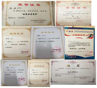 在校期间获国家励志奖学金、一等奖学金、二等奖学金、校三好学生、优秀学生干部、校优秀共青团员、校优秀共青团干部;参与2019年省级大学生创新创业项目;参加“三下乡”大学生社会实践活动1次;优秀志愿者,优秀工作者若干;带领班级获得校级优秀班集体、校级五四红旗团支部。