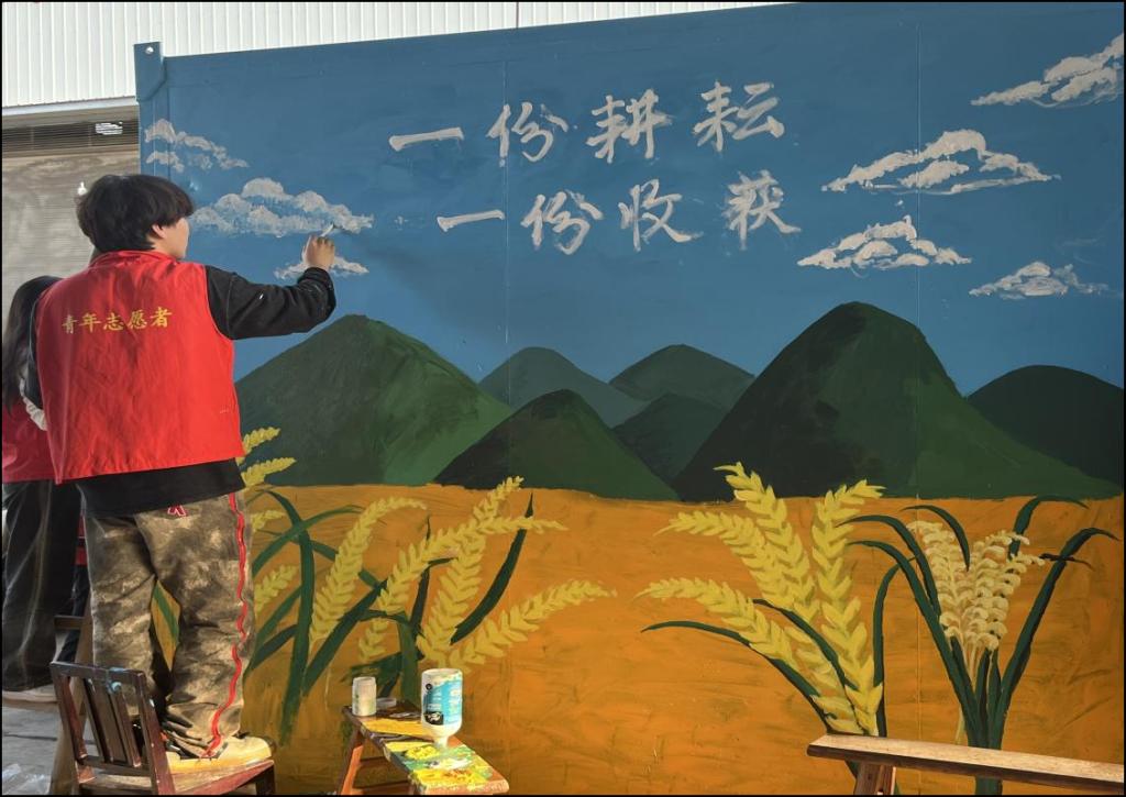 关注“三农”,开展志愿服务行动,助力美丽乡村建设是师生们的此行的主要目的,他们要用专业知识和手中的笔画出美丽乡村建设的同心圆。到村后,9名师生顾不上休息和欣赏美景,立即投入到工作中,他们两人或三人为一组,在村里提供的空墙上打边框、勾线条、上色彩;他们默契配合,不辞辛劳,历时30小时,精心绘制了反映播种、耕作、收获、丰收等场景的大型墙画4幅,受到村委会和村民们的一致好评。