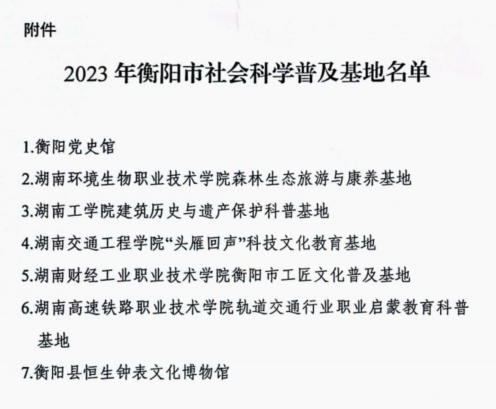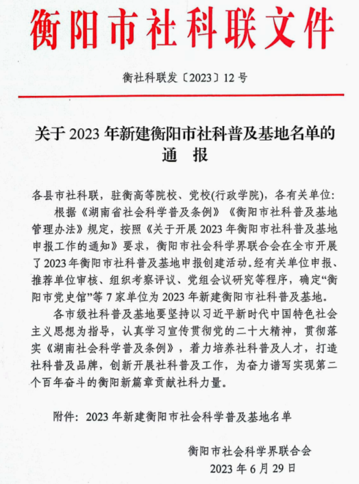 近日,衡阳市社科联公布了2023年新建衡阳市社会科学普及基地名单,我院申报的“建筑历史与遗产保护科普基地”获批。