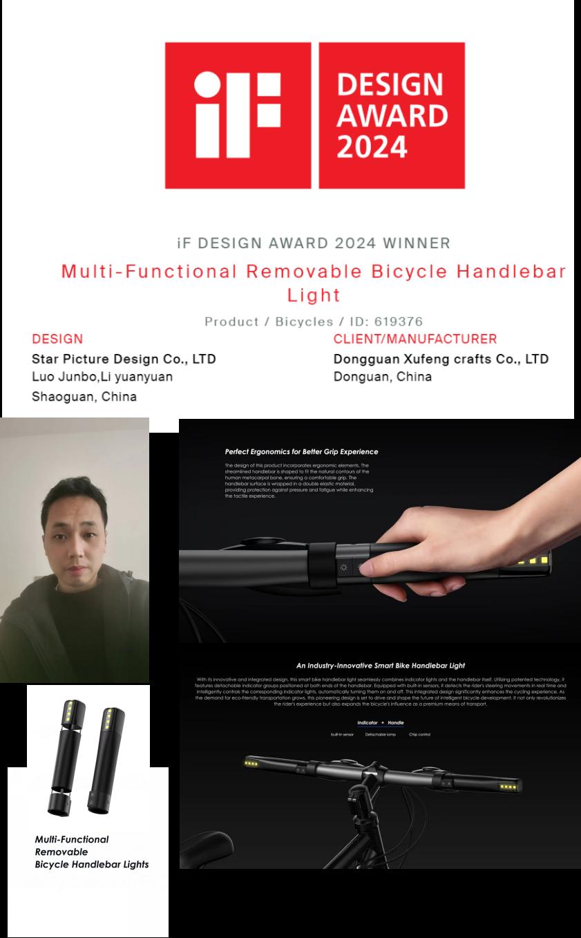罗军波获奖作品是以创新思路对智能自行车把手灯进行整合设计,将转向指示灯与把手完美融合。它采用专利技术,在把手两端嵌入可拆卸的指示灯组,通过内置传感器实时感知骑手转向动作,并由智能芯片控制对应指示灯自动亮灭,极大提升了骑行体验。随着低碳出行需求日益增长,他的创新设计将带动和影响自行车智能化发展的未来方向。这不仅重塑了骑手体验,也将扩大自行车这一优质出行工具的影响力。