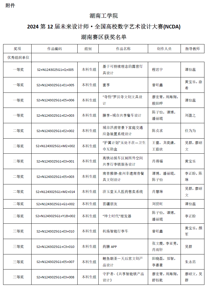 近日,伟德首次组织参加的第12届未来设计师–全国高校数字艺术设计大赛传来喜讯,程思宇同学的参赛作品《基于可持续理念的露营灯具设计》在全国赛中获得一等奖;曾旺鑫同学的参赛作品《蜜享》获全国赛二等奖;廖宏青等同学的参赛作品《“寺悟”罗汉寺文创文具设计》及陈子怡等同学的参赛作品《膳享--城市共享餐车设计》获全国赛三等奖。此次获奖也创造了伟德设计类全国大赛新的历史。