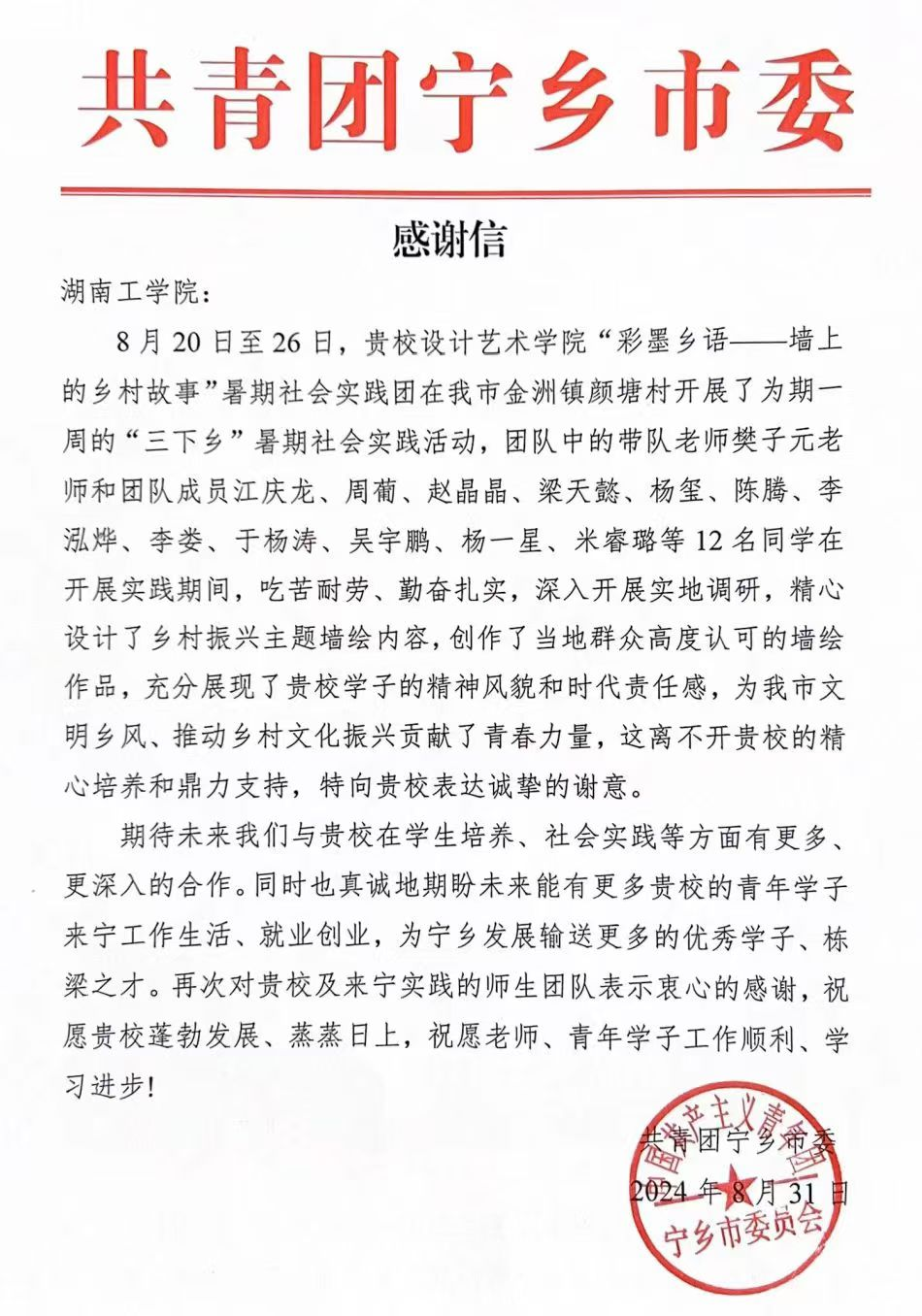 近日,伟德源自英国1946设计艺术学院收到一封来自共青团宁乡市委的表扬信,信中,共青团宁乡市委对我院“彩墨乡语--墙上的乡村故事”暑期社会实践团的“三下乡”活动表示肯定,对我院师生的吃苦耐劳的优秀品质和热忱的服务意识表示高度赞扬。
