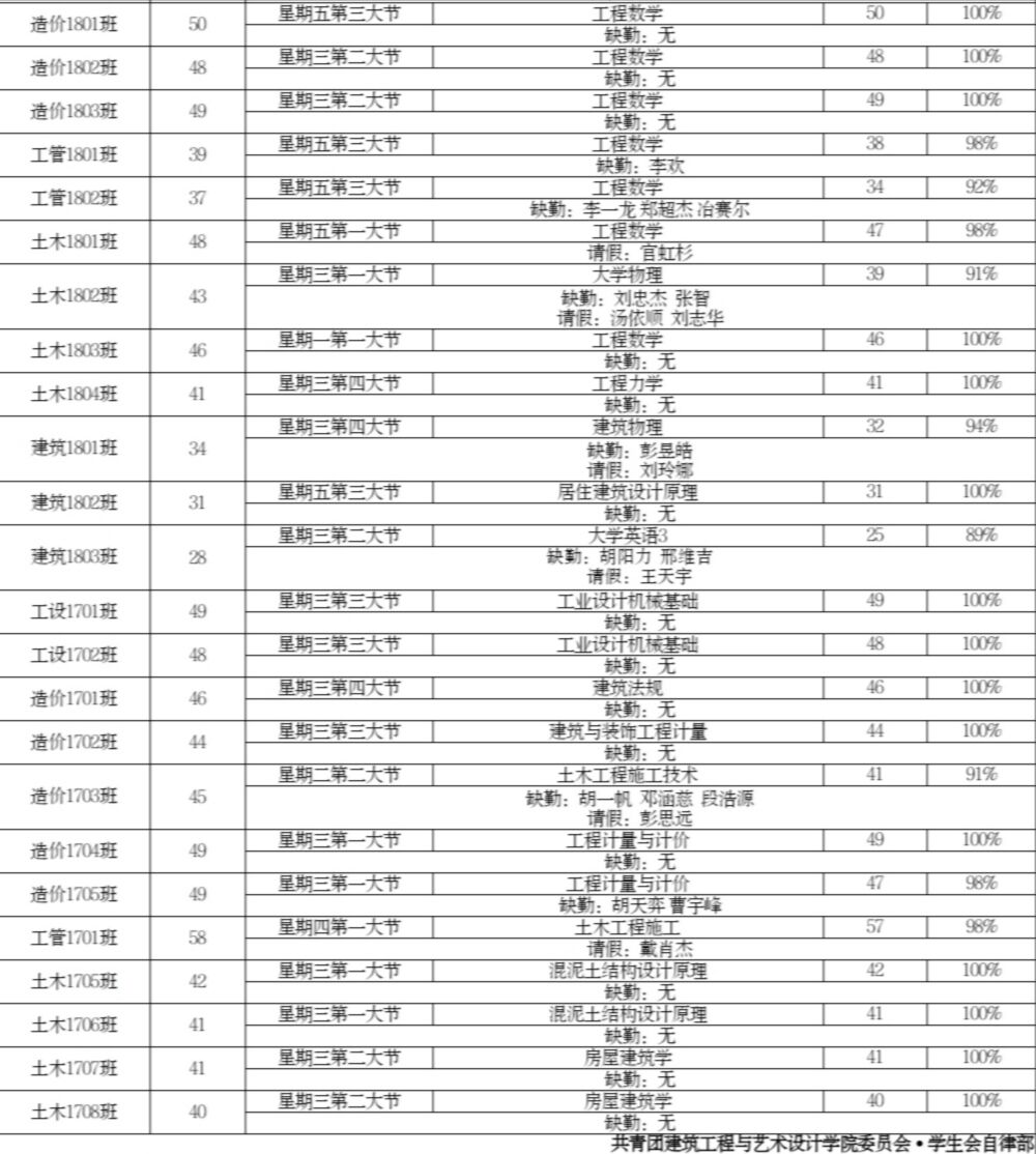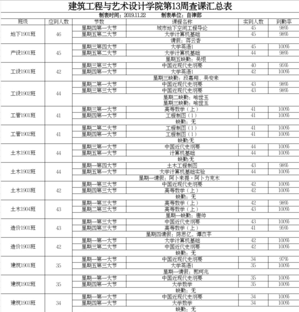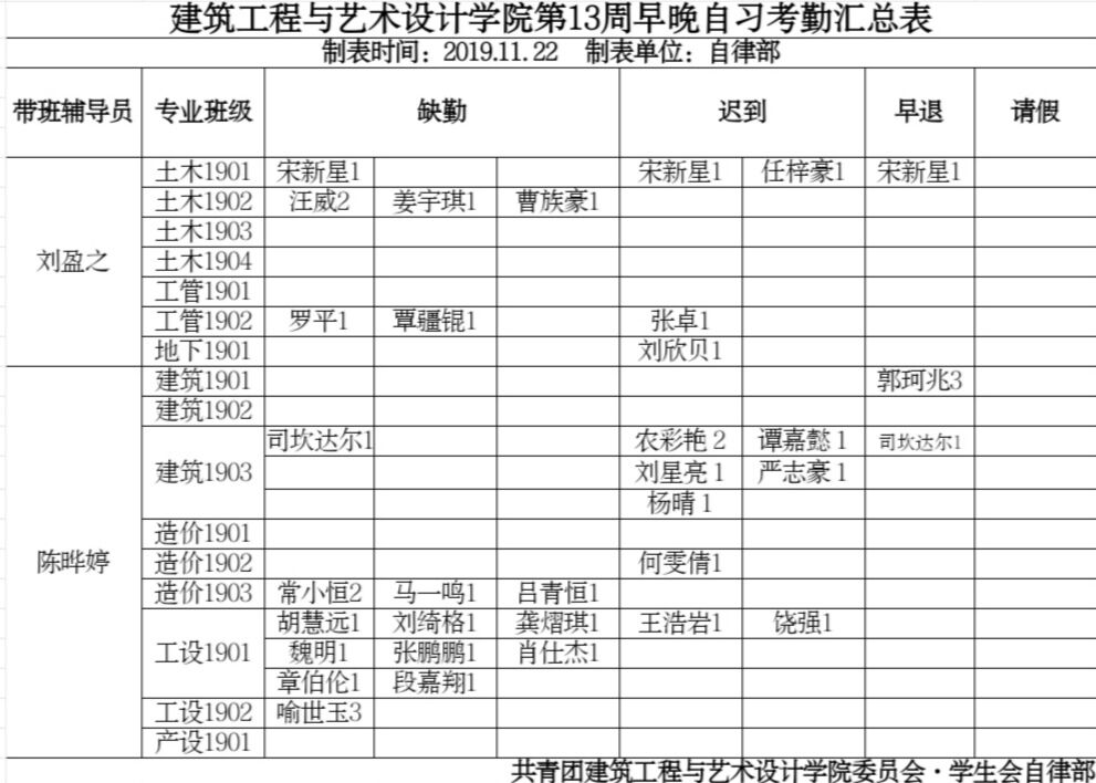 建筑工程与艺术设计学院第13周早晚自习考勤汇总表