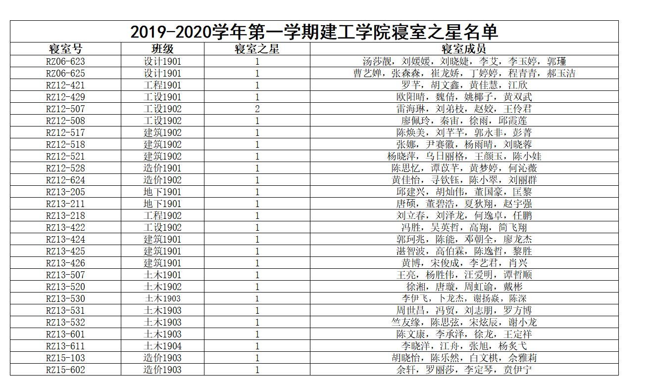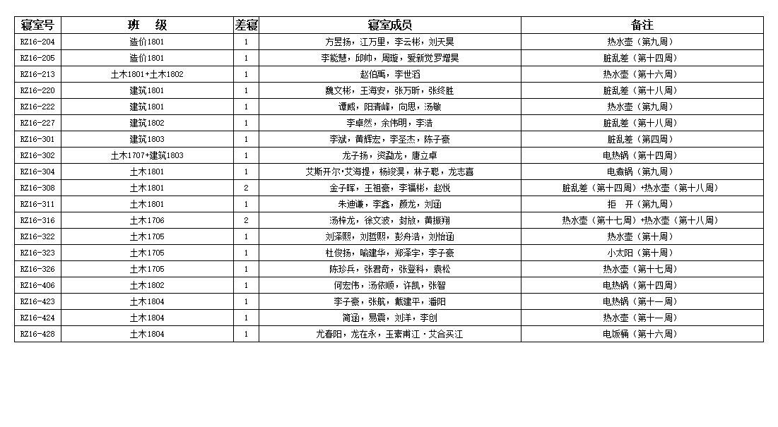 至上周,本学期的查寝情况汇总也已经出来,具体内容如下图 此次数据已引起辅导员的高度重视,希望各班委与寝室长对此也能重视起来,起到监督与带头的作用,同时希望做的好的寝室能够继续保持,做的不好的寝室也要多多改善,我们也将根据相应的规章制度,对下列寝室作出相应的奖励与惩处。(文/宿管部)