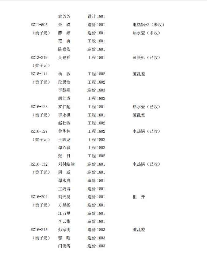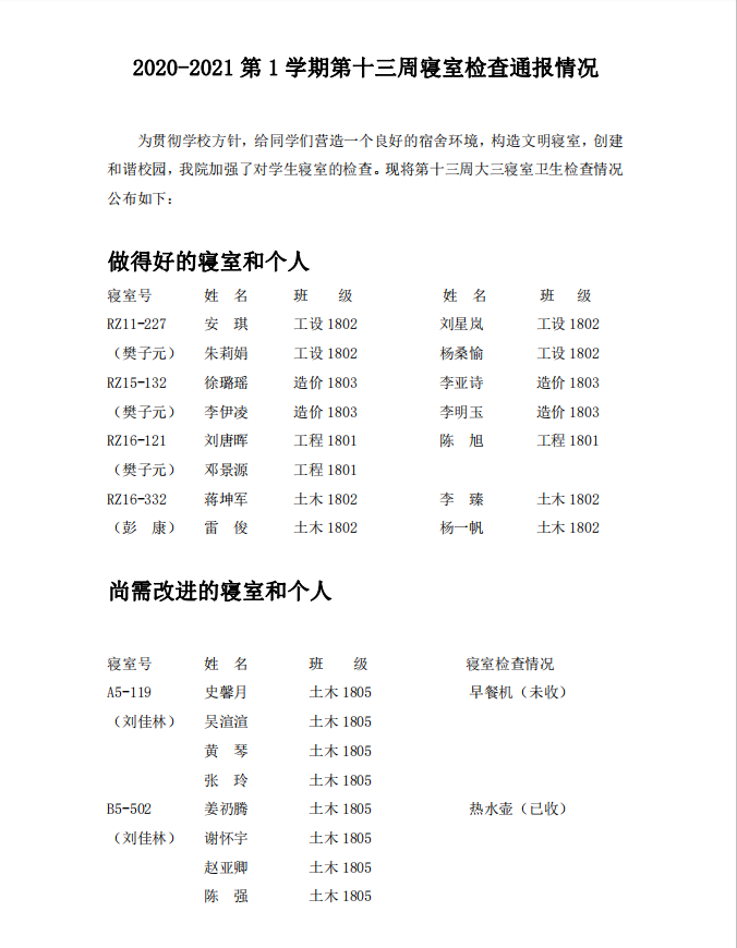 2020-2021第1学期第十三周寝室检查通报情况