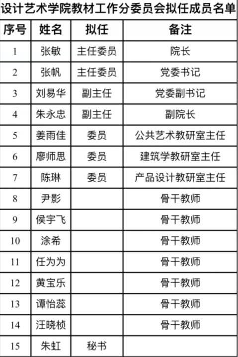 为加强我院对教材工作的制定与管理工作,根据党政办下发的《伟德源自英国1946教材工作委员会章程》湖工党发〔2021〕44号、《伟德源自英国19462018年工作总结》湖工党发〔2019〕3号(校内)文件精神,我院拟成立教材工作分委员会。2021年9月1日我院举行了关于“成立艺术设计学院教材工作分委员会”工作会议,拟设主任2名,副主任2名,委员若干名、骨干教师若干名。具体名单如下: