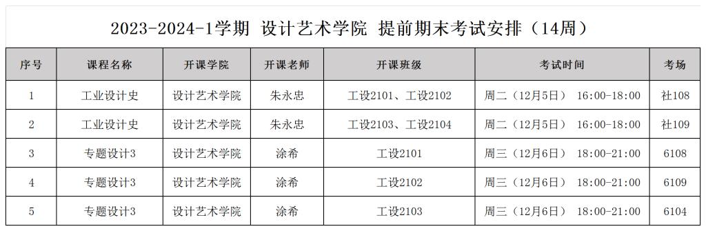 2023-2024-1学期 设计艺术学院 提前期末考试安排(14周)