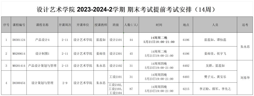 设计艺术学院 2023-2024-2学期 期末考试提前考试安排(14周)