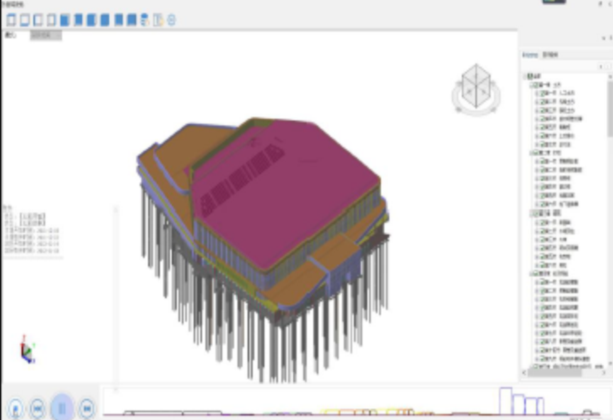 在建立体育馆模型之后,编制进度计划时间的基础上,将施工工序的工期与模型构件依次关联起来,沙盘模拟可以实际记录本工程现场的施工状况以及施工工序,对比实际进度和计划进度之间的出入,现场施工人员更方便效率的做出相应的调整。