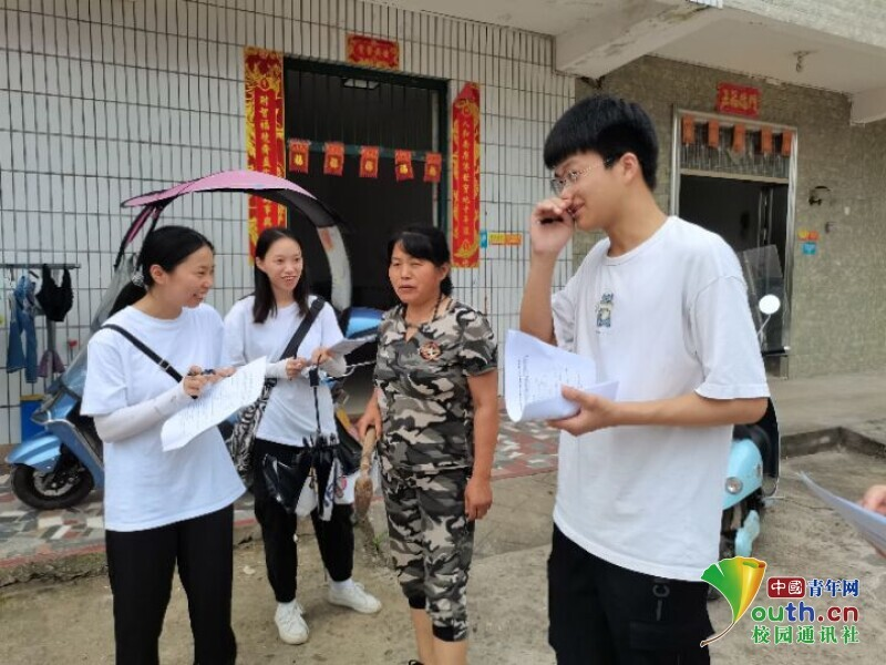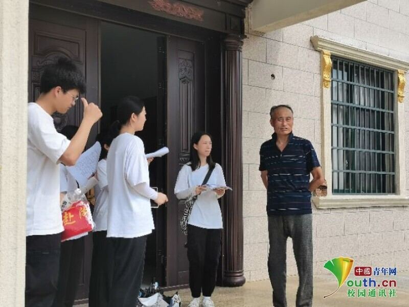 图为“农产品种植产业现状调查和助力乡村振兴”暑期社会实践团对西渡镇当地居民进行问卷调查