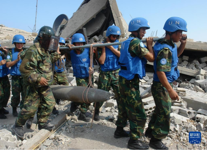 2006年8月28日,在黎巴嫩纳古拉村,中国维和部队排爆官兵排除一枚未爆炸弹。新华社发(李春年摄)
