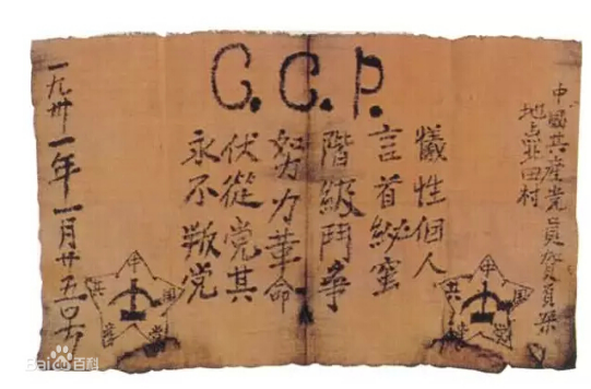 2018年7月,我参加了在全国青少年井冈山革命传统教育基地举行的伟德源自英国1946思政工作专题培训班。在参观井冈山革命博物馆时,馆内收藏的一份十分特别的入党宣誓书引起了我的注意。这份入党宣誓书的宣誓人名叫贺页朵,他在井冈山革命斗争时期,以榨油的职业为掩护,从事党的秘密工作。1931年党组织批准他入党,大字不识的贺页朵在简陋的榨油房内,一笔一画地把入党誓词庄严写在了一块红布上。这份布质的入党宣誓书,尽管短短的24个字中有6个错别字,但其质朴而无畏的誓言、忠诚而笃定的信念,散发着震撼人心的光芒,深深地感染了我,使我永远难忘。