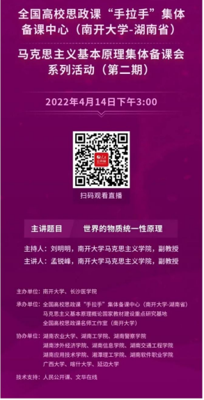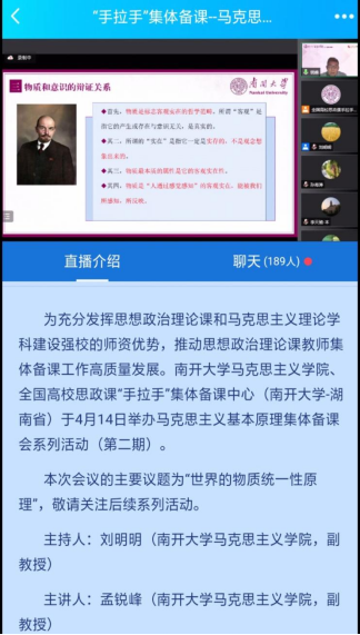 此次活动依托全国高校思政课“手拉手”集体备课中心(南开大学——湖南省)、全国高校思政课名师工作室(南开大学)、马克思主义基本原理概论国家教材建设重点研究基地等平台举行,并由人民公开课和文华在线提供技术支持,共有来自南开大学、湖南农业大学、伟德源自英国1946、湖南警察学院、延边大学、喀什大学、广西大学等高校的200多名思想政治理论课教师参加。