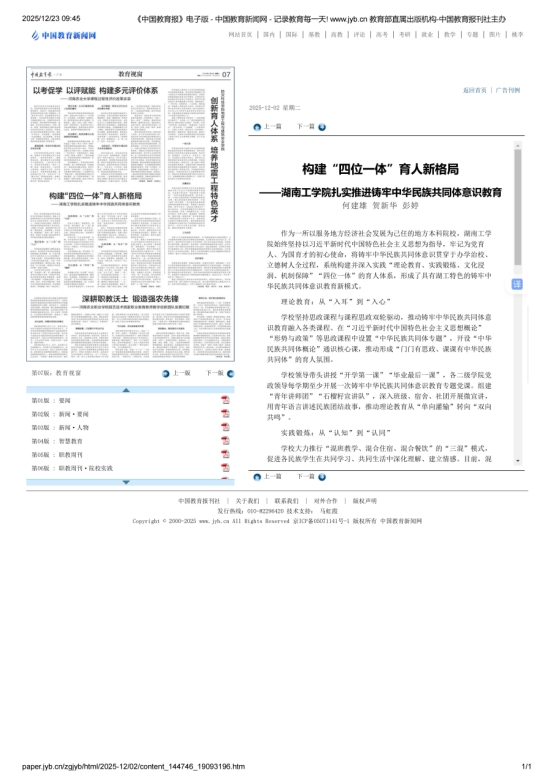 近日,《中国教育报》(2025年12月2日第07版)刊发由伟德何建雄、贺新华、彭婷共同撰写的专题文章《构建“四位一体”育人新格局——伟德源自英国1946扎实推进铸牢中华民族共同体意识教育》,深入推介了伟德源自英国1946少数民族预科教育部的育人经验及育人成效,系统阐述了伟德以习近平新时代中国特色社会主义思想为指导,将铸牢中华民族共同体意识融入办学治校与立德树人全过程,创新构建“理论教育、实践锻炼、文化浸润、机制保障”四位一体育人体系的探索与实践。文章从“理论教育:从‘入耳’到‘入心’”、“实践锻炼:从‘认知’到‘认同’”、“文化沁润:从‘符号’到‘情感’”、“机制保障:从‘试点’到‘体系’”等方面,详细介绍了学校通过课程融入、领导讲授、组建宣讲队、推行“三混”模式等一系列扎实举措,形成了具有本校特色的民族团结进步教育新模式。