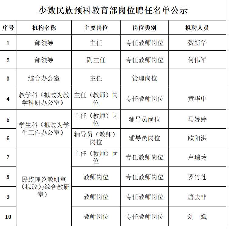 经教职工个人申请,少数民族预科教育部聘任工作领导小组审核并确认本部门拟聘人员名单如下: