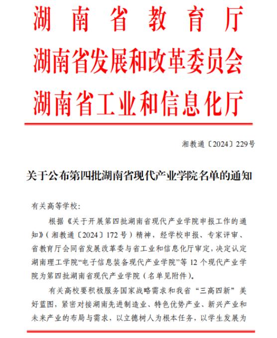 今年7月,湖南省教育厅下发了《关于开展第四批湖南省现代产业学院申报工作的通知》(湘教通〔2024〕172号),按照学校工作安排,教务处精心组织开展了申报工作,经深入调研、精准指导、学院申报、专家评审,学校推荐1个现代产业学院参评。近日,经省教育厅组织专家评审,被认定为省级现代产业学院。
