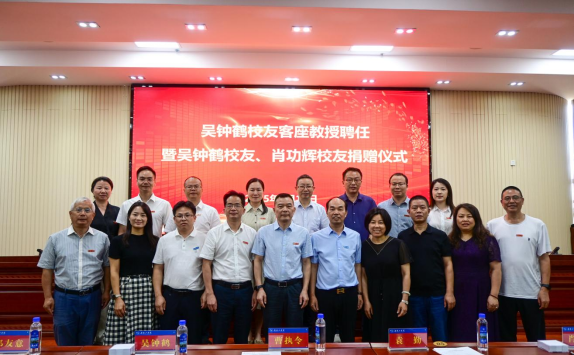 离开土木学院后,校友一行参加了在船山报告厅举行的吴钟鹤校友客座教授聘任仪式及广东红球建材科技有限公司、广东新江消防工程有限公司捐赠仪式,分别为母校捐赠款100万元和5万元。校党委书记曹执令,党委委员袁勤出席。学校各二级学院党委书记、校友联络中心、教育基金会全体成员及土木与建筑工程学院师生代表共同参与。