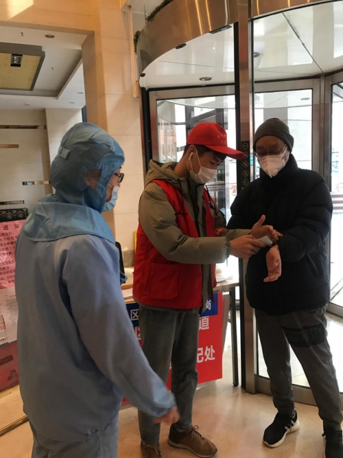 (靳硕在为居民测量体温)