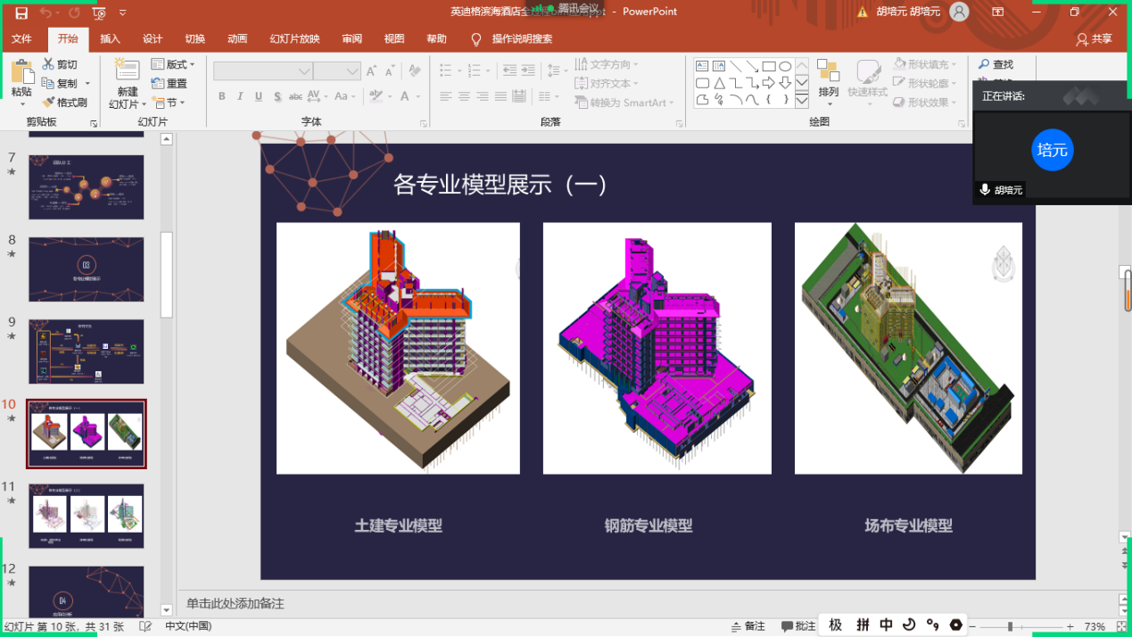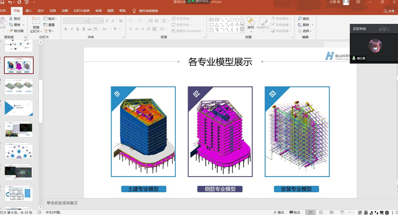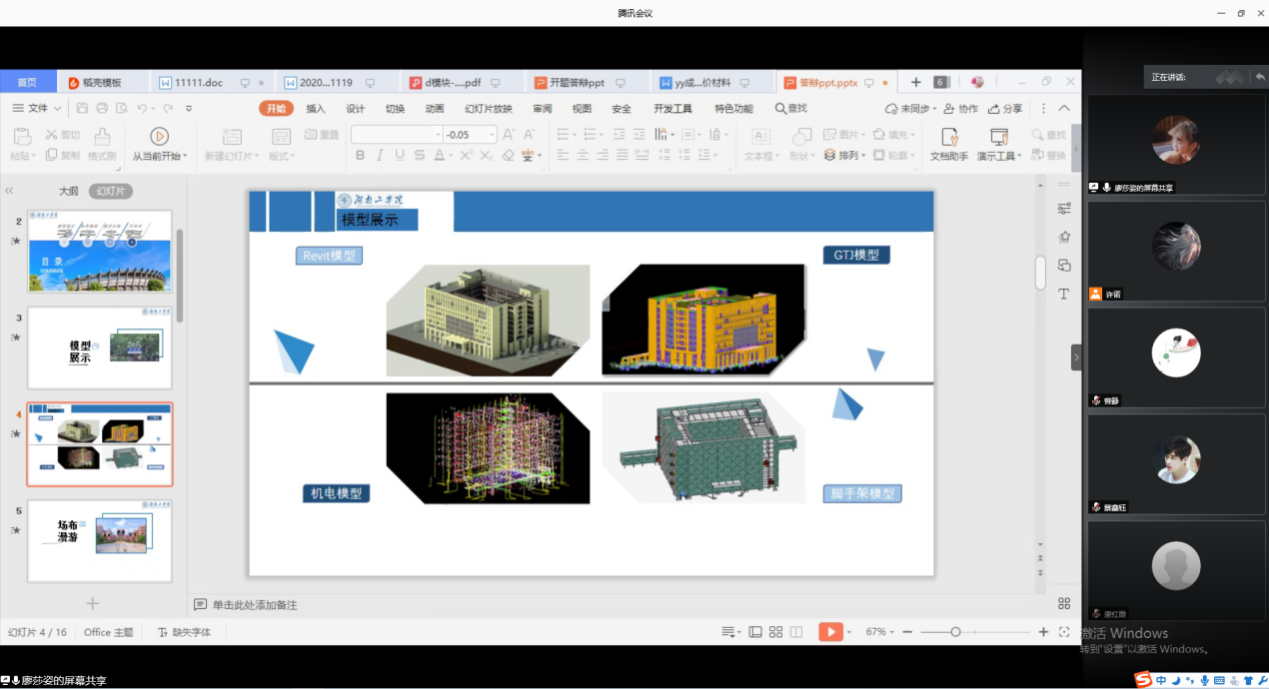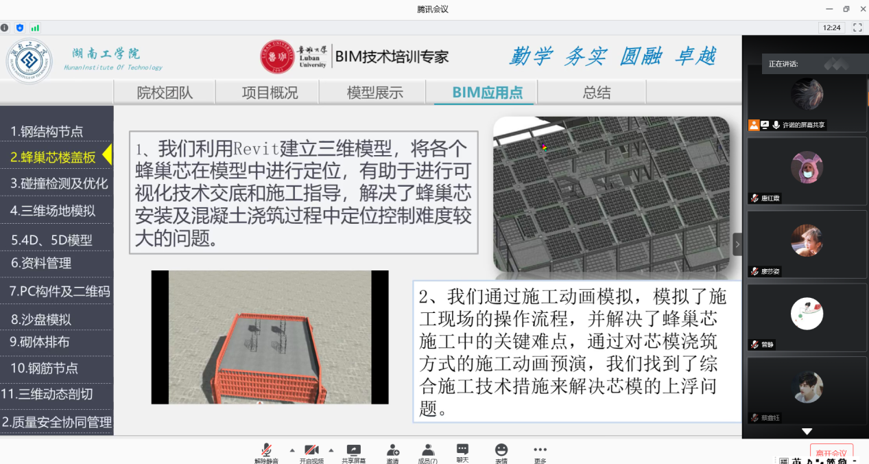 答辩首先进行的是游春华院长代表致辞。游院长从不同角度分享了自己对BIM技术的深入见解以及对大三同学们的深切期盼。接着是参与本次答辩的四个队伍按照会前抽签顺序依次进行PPT讲解及视频展示,呈现了一场精彩绝伦的线上毕业答辩。