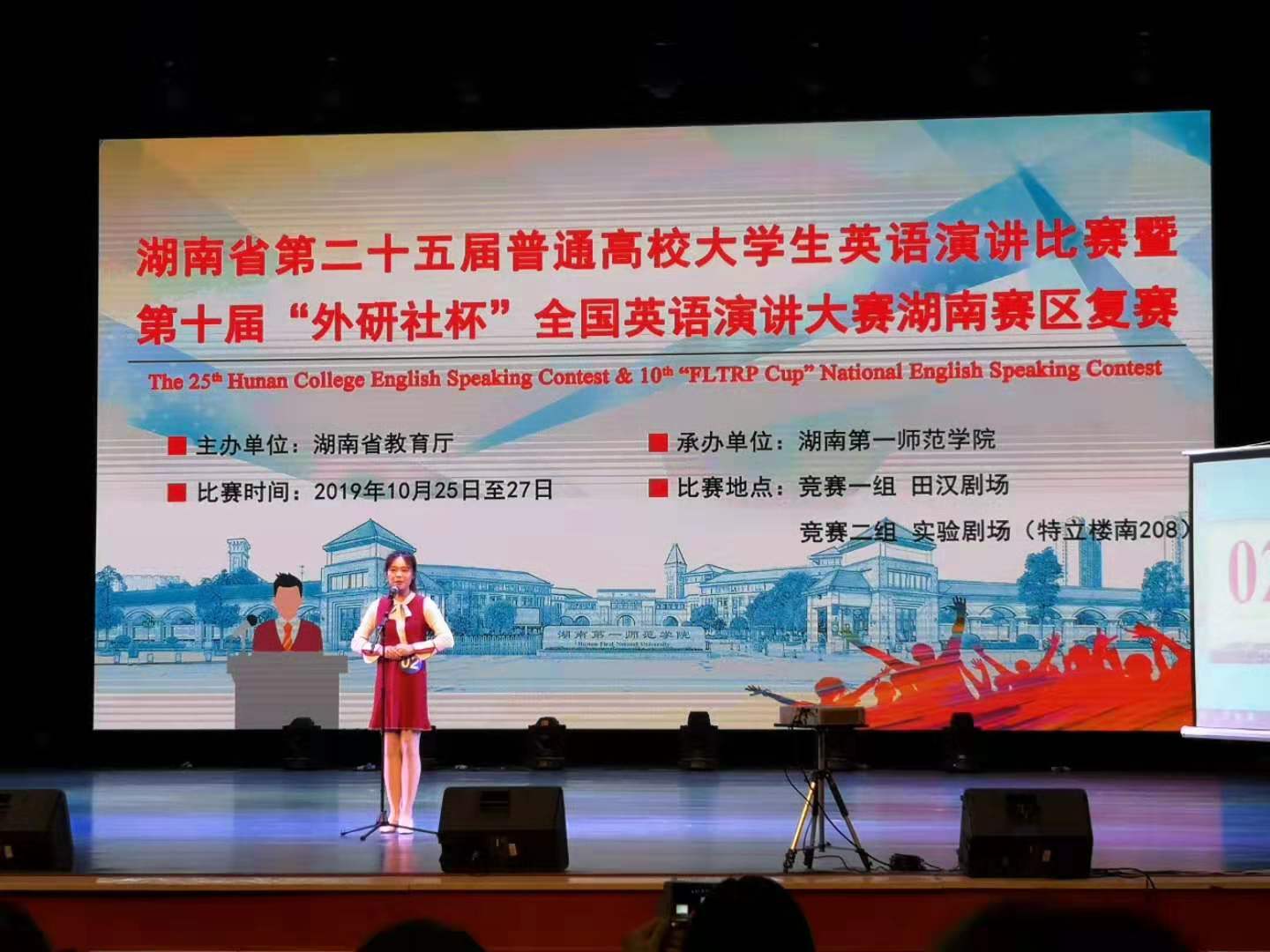 10月25日至27日,由省教育厅主办的湖南省第二十五届普通大学生英语演讲比赛暨第十届“外研社杯”全国英语演讲大赛湖南赛区复赛在湖南第一师范学院举行。
