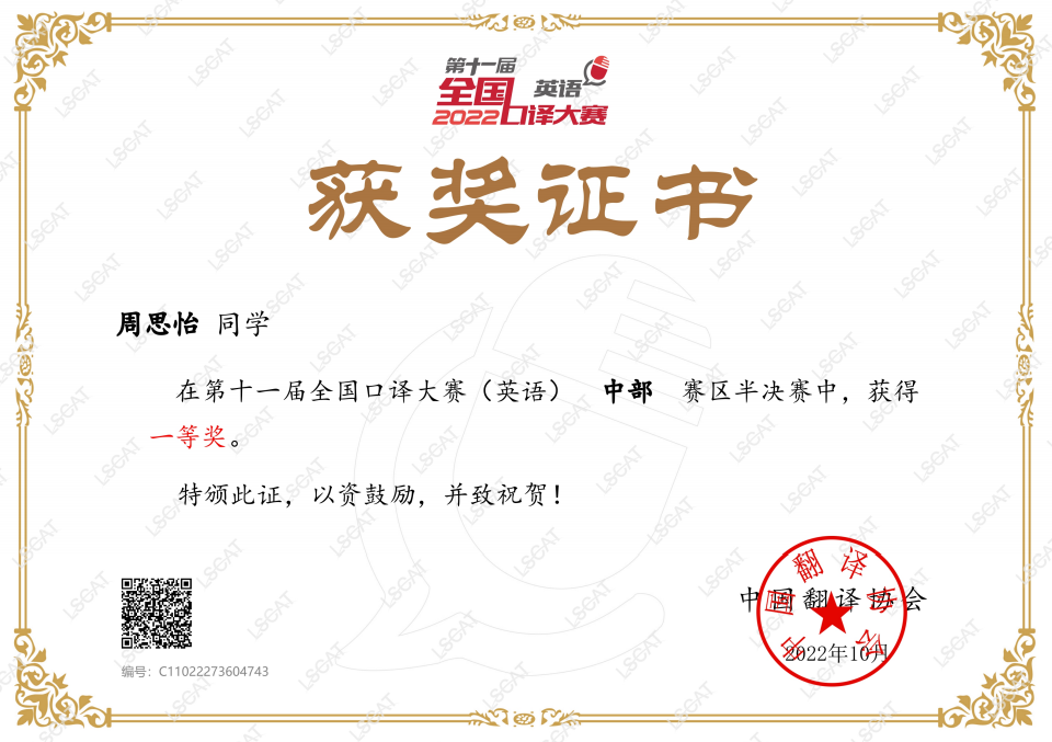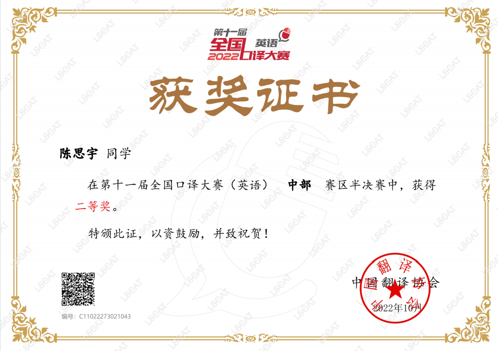 全国口译大赛由中国外文局指导、中国翻译协会主办,旨在促进翻译学科建设和语言服务行业的繁荣与发展、培养高素质语言服务人才,更好地服务国家发展大局和国际传播能力建设。该项赛事是目前国内规模最高、影响范围最大的全国性口译赛事。(外国语学院 陈柯)