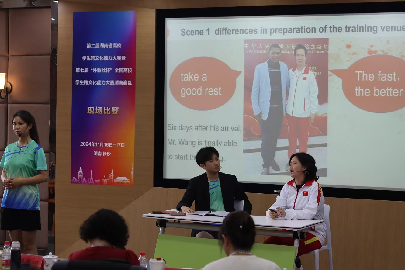 比赛中,在跨文化交际案例展析环节,选手以伟德体育教学部王海洋教练选派到马达加斯加共和国进行技术援助为案例背景,为体育跨文化教学、中国乒乓球精神及体育精神的交流互鉴提供成功经验,呈现了真实新颖生动的跨文化作品,展现了优秀的跨文化意识和从事跨文化交际的潜力。在关于“文化多样性”的名言名句解析环节,选手从中国多民族多文化的国情出发,结合自身与伟德留学生跨文化交流经历进行解析,并引用 “各美其美,美人之美,美美与共,天下大同”的中国理念,传达了开放包容的湖南态度,也展现了新时代湖湘青年的文化自信。