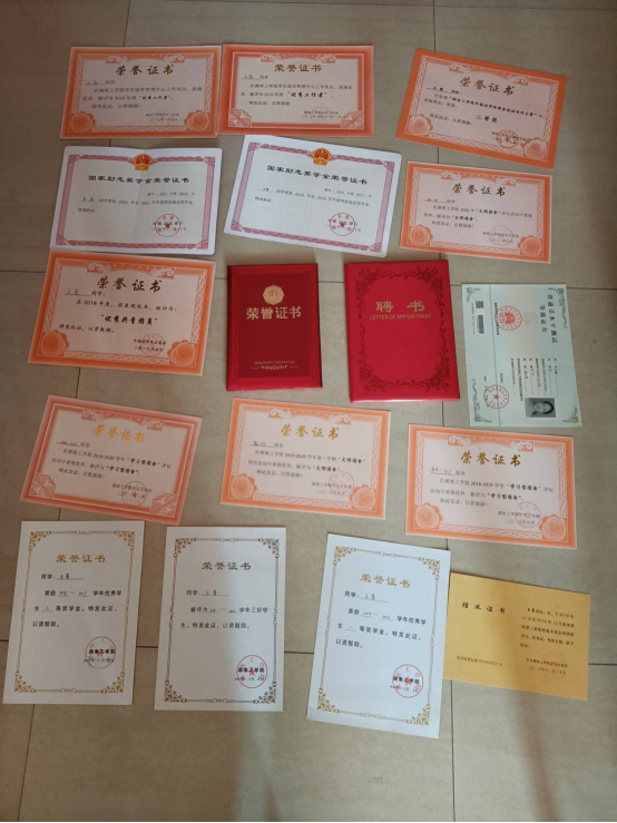 在校期间获国家励志奖学金、一等奖学金、二等奖学金、三等奖学金、三好学生、校优秀共青团员、院优秀共青团员;荣获2021年“外国语学院商务英语写作大赛”二等奖;在部门任职期间多次被评为优秀志愿者,优秀工作者。