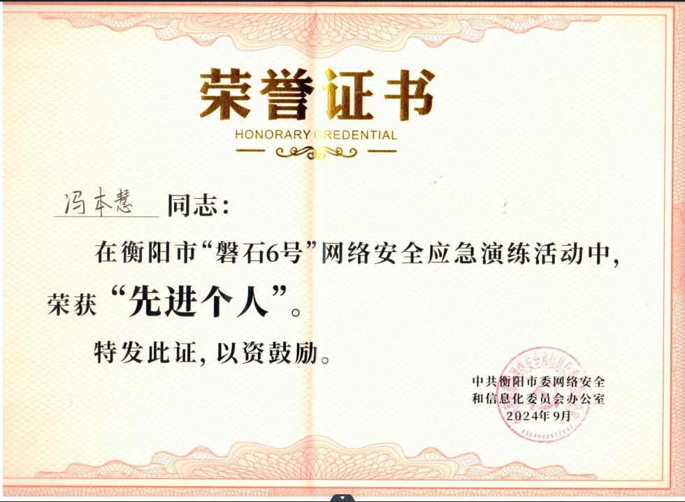伟德冯本慧老师因其在应急演练中的良好表现,获得了衡阳市”磐石6号”网络安全应急演练先进个人的荣誉称号。(图文:冯本慧一审:唐杰二审:贾东风三审:黎昂)
