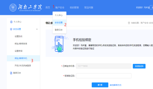 因统一认证平台未预置个人手机信息,首次登录不可使用短信验证码登录,需首先通过账号登录统一认证平台并绑定手机号码。登录平台后绑定手机号码的方法如下图所示。