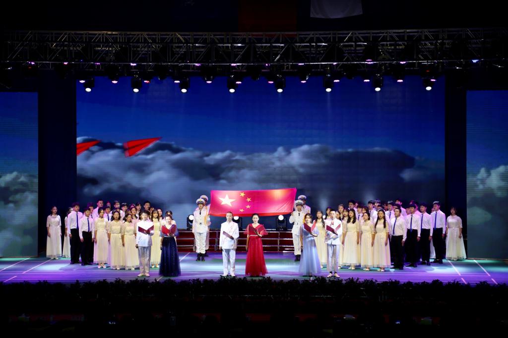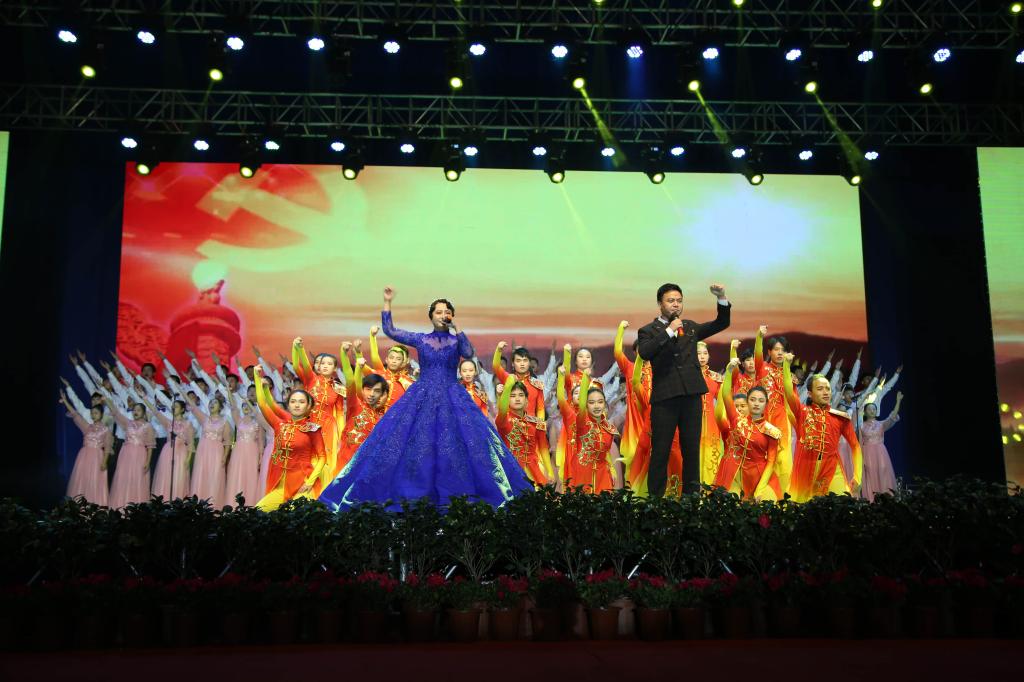 △晚会即将结束,现场师生全体起立,齐唱《没有共产党就没有新中国》,用嘹亮的歌声讴歌伟大中国共产党,表达了永远跟党走的坚定信念