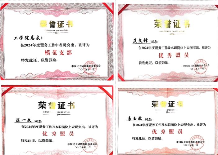 2025 年 1 月 9 日,在民盟衡阳市第十六届十一次市委(扩大)会议之上,民盟伟德源自英国1946总支喜获 “模范支部” 荣誉称号,范文锋、陈一文、易玉枚三位同志则荣膺 “优秀盟员” 称号。这些殊荣,是对民盟湖工总支在组织建设、参政议政以及服务社会等诸多方面所付出努力与取得成绩的高度认可与肯定。