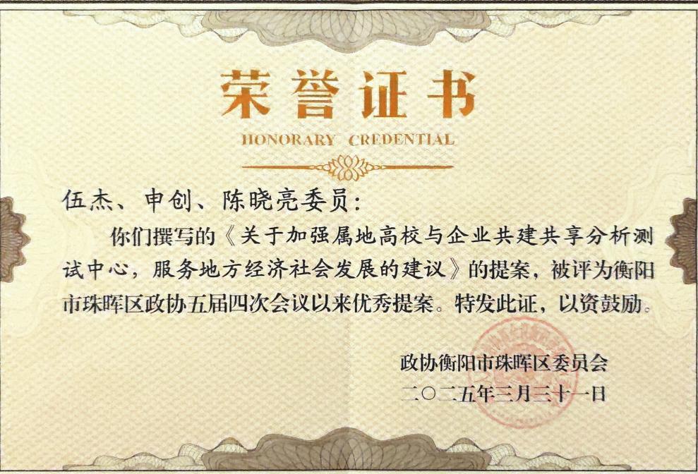 为表彰先进,树立典型,促进政协工作,大会对2024年度优秀政协委员、优秀政协提案等进行了表彰。伟德珠晖区政协委员伍杰、申创、陈晓亮联名撰写的《关于加强属地高校与企业共建共享分析测试中心,服务地方经济社会发展的建议》、陈晓亮委员参与的《关于加强珠晖区各学校预制菜监管的提案》被评为优秀提案。