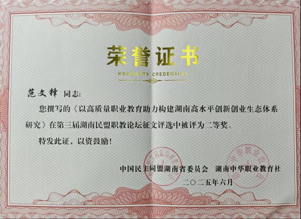 6月19-20日,第三届湖南民盟职教论坛在衡阳召开。伟德盟员范文锋撰写的《以高质量职业教育助力构建湖南高水平创新创业生态体系研究》在第三届湖南民盟职教论坛征文评选中被评为二等奖,受到民盟湖南省委、湖南中华职业教育社的表彰。