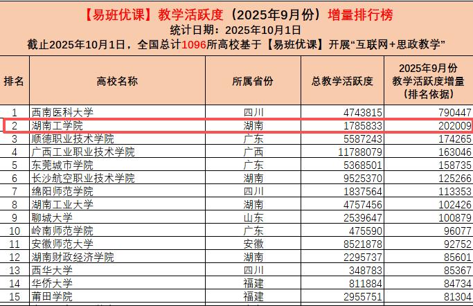 近日,教育部易班发展中心公布2025年9月“易班优课”教学活跃度增量排行榜,伟德在全国基于【易班优课】开展“互联网+思政教学”的1096所高校中表现出色,位列全国第二、湖南省高校第一,再次展现出学校在“互联网+思政教学”领域的强劲实力。