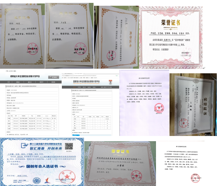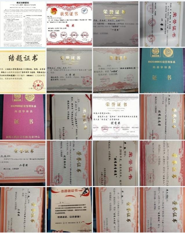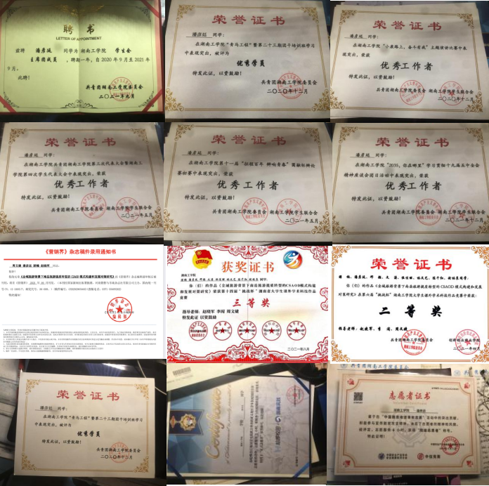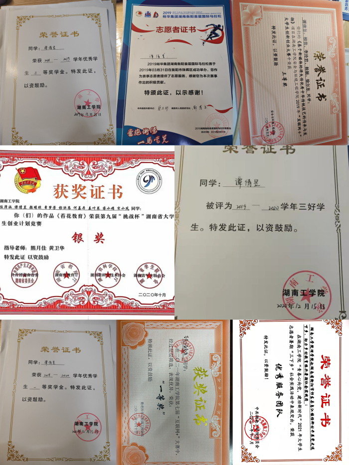 在校期间荣获国家励志奖学金2次,校级一等奖学金2次,校级三等奖学金1次,优秀共青团员1次,优秀共青团干1次,三好学生2次。分别以主要成员身份参与多项国家级和省级项目,在实践中检验真理;参与2020年大学生创新创业训练计划获国家级立项;积极参加第九届“挑战杯”湖南省大学生创业计划竞赛获省级银奖;积极参加第七届“互联网+”大学生创新创业大赛青红赛道荣获校级一等奖;暑假参与三下乡社会实践活动,荣获校级优秀服务团队等荣誉。