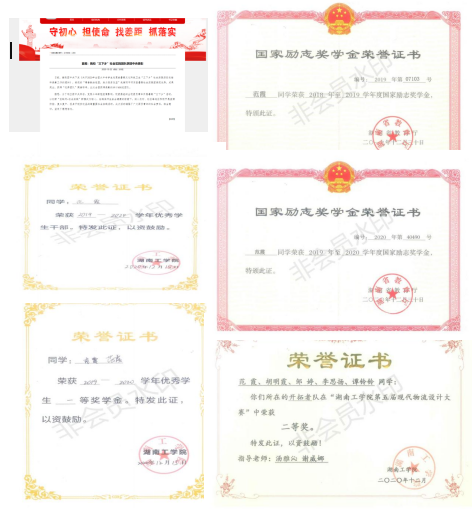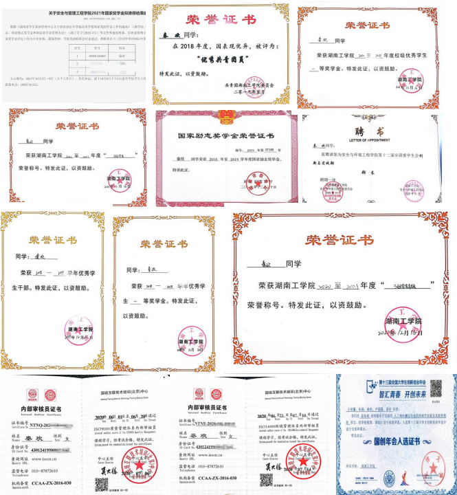 在校期间学习成绩与综合测评成绩连续三年在专业名列前矛;获国家励志奖学金2次、校级一等奖学金2次、校级三好学生2次、优秀学生干部2次、优秀共青团干部1次,优秀共青团员1次。积极参与创新创业大赛,为2020年大学生创新创业计划大赛国家级立项成员;获第九届“挑战杯”湖南省大学生创业计划竞赛银奖;第二届“高新杯”衡阳市创新创业大赛暨第六届“创青春”大赛团队组优秀奖;成功入住校级创业孵化基地。刻苦专研,参与湖南省教育厅优秀青年科研项目“连续、间歇动态拉力作业肌肉疲劳分析与预测建模”并成功结题;在《人类工效学》协助发表《模拟凿破作业肌肉疲劳发展实验研究》和《间歇拉物行走作业条件下拉力降幅特征分析》两篇论文。